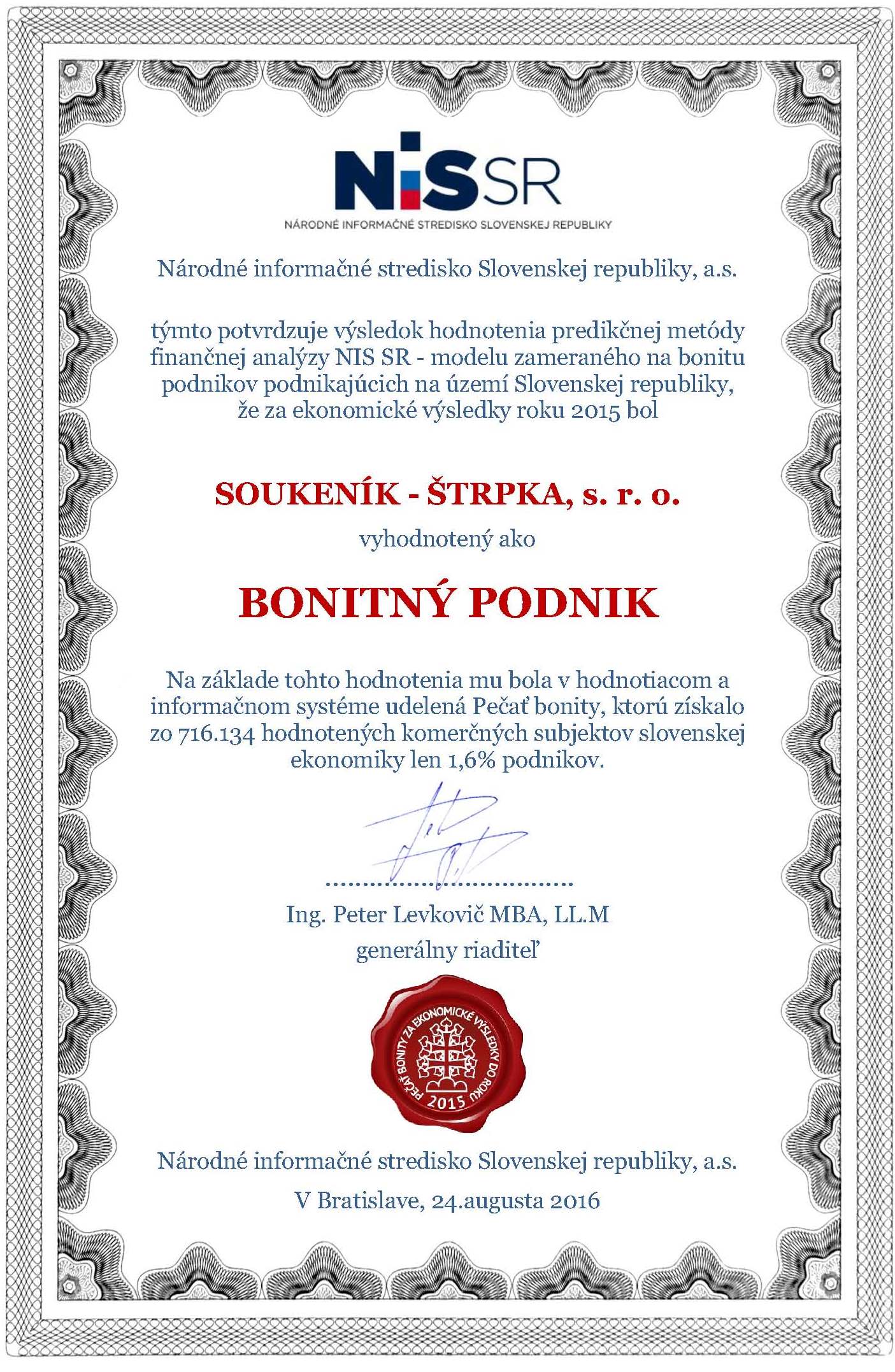 Národné informačné stredisko Slovenskej republiky každoročne analyzuje hospodárske prostredie a ekonomické zdravie podnikov na Slovensku. Advokátskej kancelárii SOUKENÍK - ŠTRPKA bola za priaznivé ekonomické výsledky v roku 2015 v hodnotiacom systéme SIMS a NiS SR udelená PEČAŤ BONITY, ktorá deklaruje našu firmu ako firmu serióznu, ekonomicky stabilnú, dôveryhodnú a bonitnú.